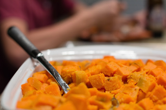 Peel and cut yams into chunks and place in a 9-by-13 inch baking dish.